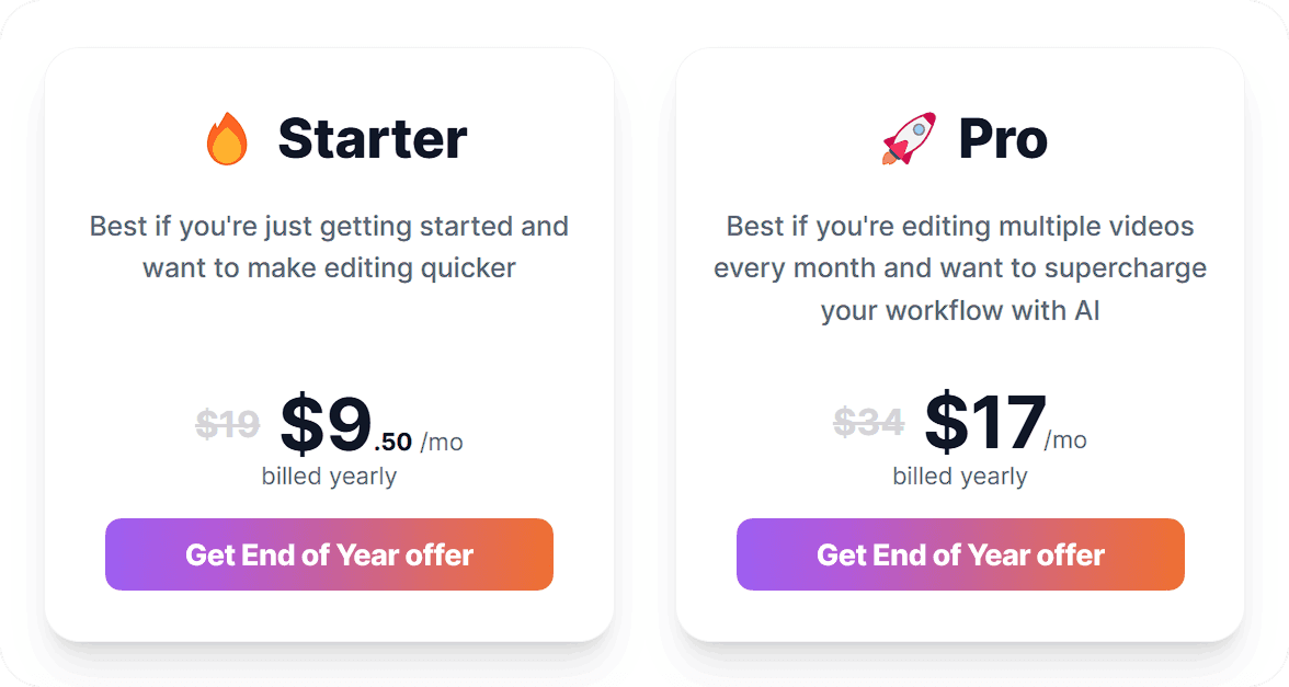 To get the deal applied to your existing plan, email support@firecut.ai by 11:59pm UTC on 31st December 2025 with the name of the plan (Starter or Pro) that you wish to purchase.